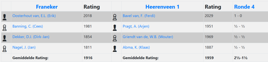 Zwart wint of een stuk of krijgt het kwaliteit terug. Eindspelen met koning + paard met pion meer zijn in het algemeen gewonnen voor de spelers met de pluspion (in tegenstelling tot een pion voorsprong in een toreneindspel). Ik hoopte dat ik genoeg had voor de winst. Gelukkig bleek het eindspel redelijk rechttoe-rechtaan. Vanuit een compleet verloren stelling na een suffe blunder (het over het het hoofd zien van Lb5 voor wit) wist ik een klein foutje van mijn tegenstander alsnog af te straffen. Franeker gaat naar huis met 2 ½ – 1 ½ .